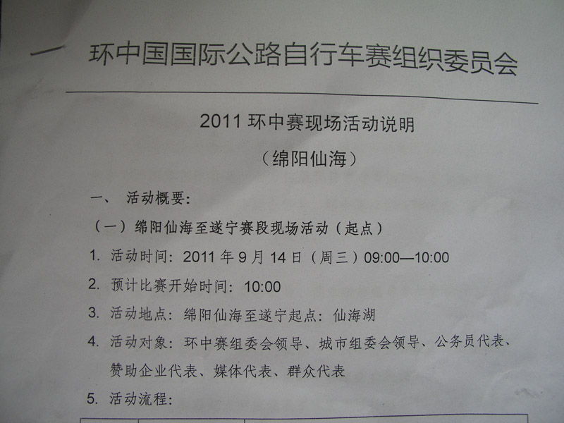 9月14日参加“2011环中赛-印迹中国”绵阳赛段荣誉/业余骑行活动流程 Post By:2011/9/2 16:18:26 [只看该作者]