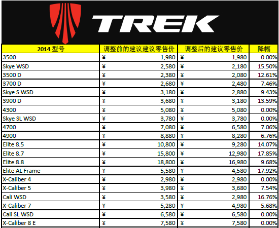 TREK中国公司将从4月1日开始对2014款自行车产品进行零售价格调整,具体价格表,请参看附件,请各店面自2014年4月1日起参照执行此零售指导价格。