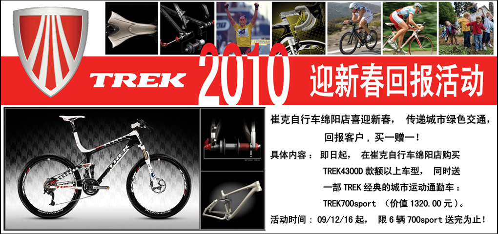 TREK 自行车绵阳店迎新春“买一赠一 回报活动”,2009年12月16日开始,不到十天,活动赠送车辆TREK700sport全部抢购完。